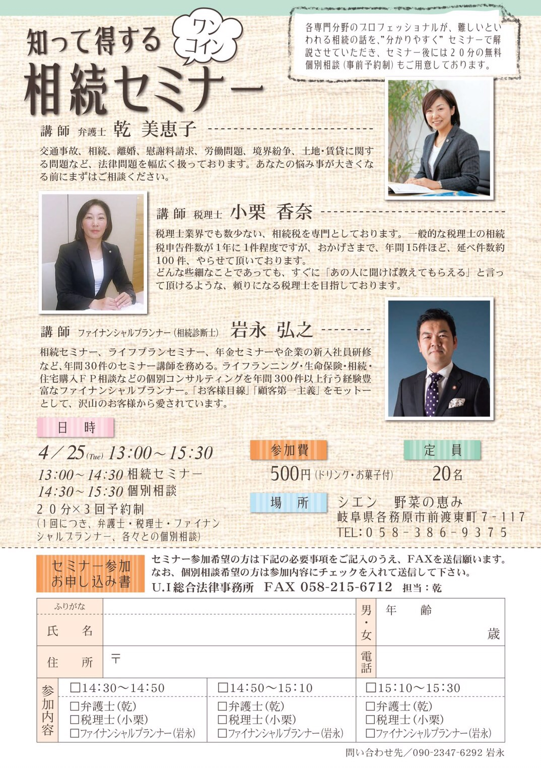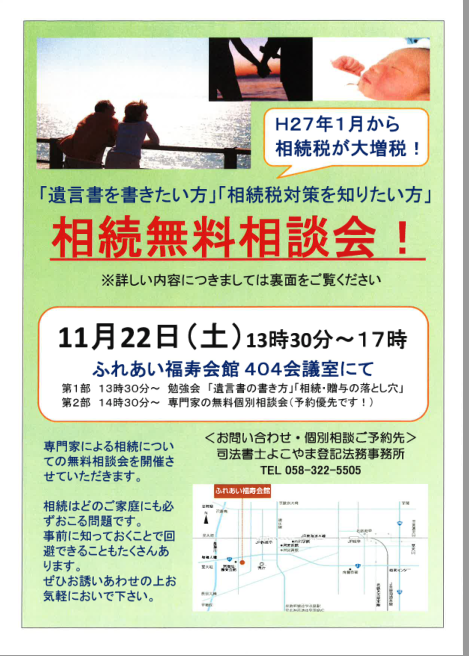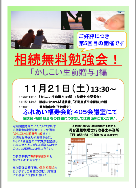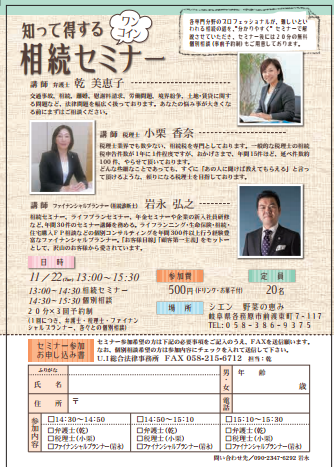| タイトル | 聞いて得する相続あれこれ ワンコイン 相続セミナー |